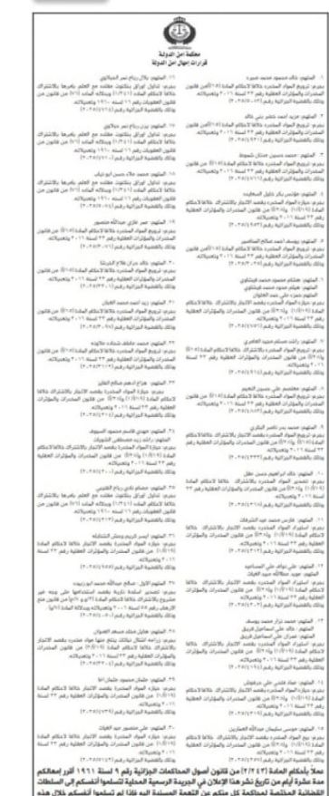ونشرت المحكمة، أسماء المتهمين، عملا بأحكام المادة 243 /2 من قانون أصول المحاكمات الجزائية رقم 9 لسنة 1961.