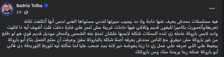 وأشارت طلبة إلى أن إنتاجها كان ضعيفًا لدرجة بدت معها وكأنها "مُصوَّرة بكاميرا هاتف قديم". غير أن أكثر ما لفت الانتباه في منشورها كان حديثها عن ممثل مجهول الهوية يرتدي "باروكة تشبه تندة المحلات"، في إشارة ساخرة أثارت فضول الجمهور حول هوية الفنان المقصود.