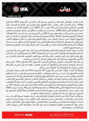 مع التأكيدِ أيضاً أننا كُنا في الاتحادِ العراقيِّ لكُرةِ القدم قد أبدينا مخاوفنا مسبقاً للأحداثِ، وما حصلَ في مباراةِ الأردن وفلسطين ضمن تصفياتِ كأس العالم، حيث سبقَ أن قدّمنا شكوى تضمنت مخاوفنا السابقة في رسالةٍ في شباط الماضي، طالبنا فيها بنقلِ مباراتنا إلى ملعبٍ محايدٍ نظراً للمعلوماتِ الأوليةِ المتوافرة لدينا، وإن الأحداثَ المؤسفةَ التي شهدها ملعبُ المباراةِ أكدت مخاوفنا تلك.