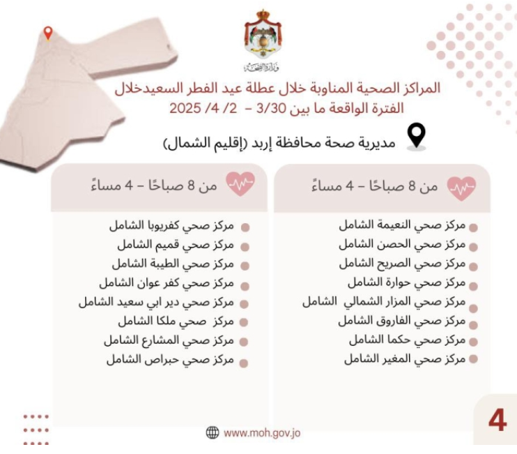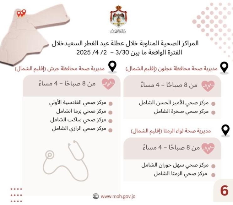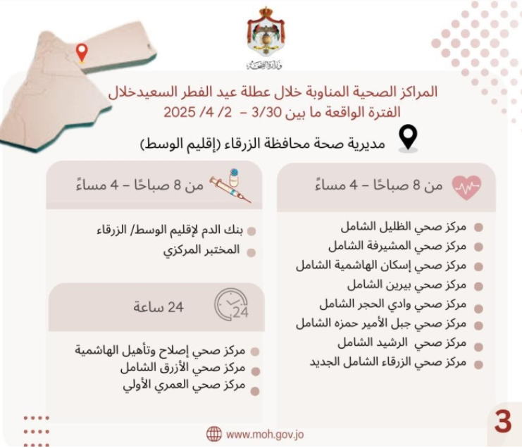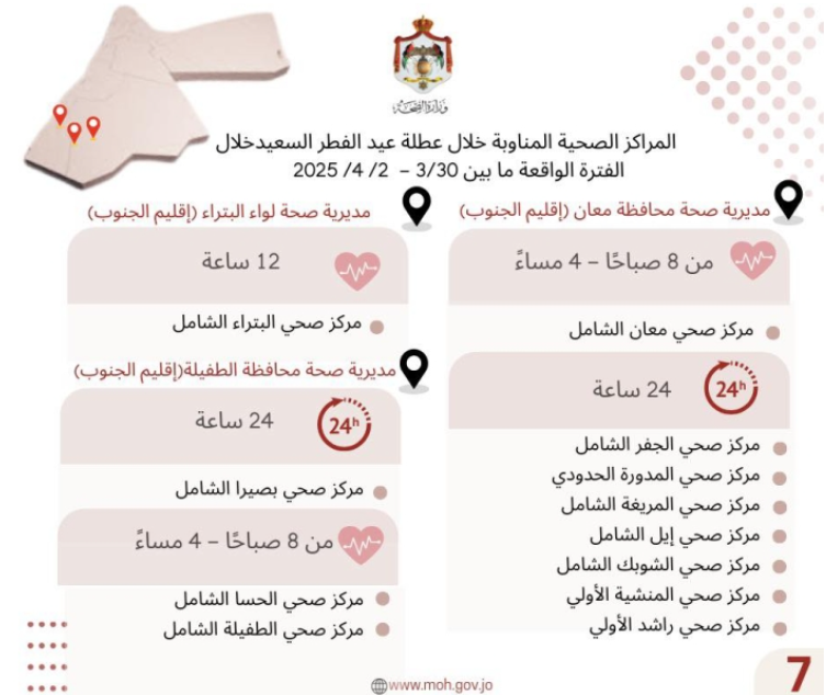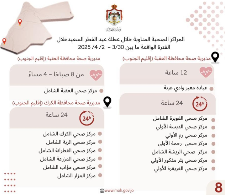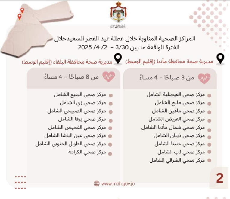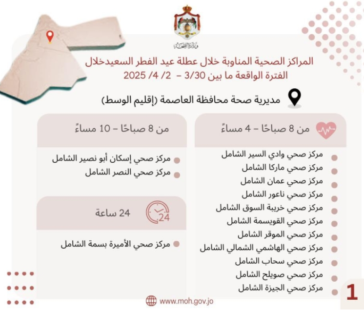 حددت وزارة الصحة اليوم السبت 117 مركزا صحيا للمناوبة خلال عطلة عيد الفطر السعيد في الفترة من 30 / 3 / 2025 ولغاية 4 / 2 / 2025 في كافة محافظات المملكة.