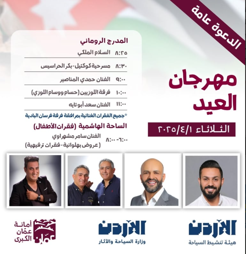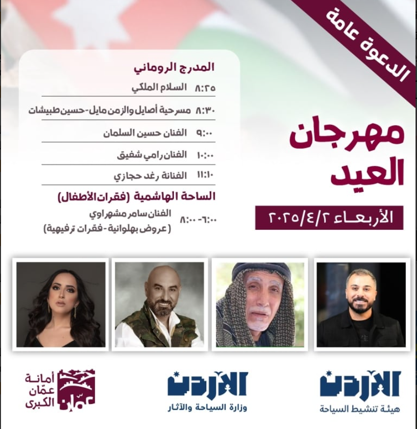 أعلنت وزارة السياحة والآثار عن تنظيم سلسلة من الفعاليات والأنشطة احتفالاً بعيد الفطر المبارك، بالتعاون مع امانة عمان والتي ستنطلق في يومي الثلاثاء والأربعاء الموافق 1 ~2 نيسان 2025، في المدرج الروماني (الساحة الهاشمية) بالعاصمة عمان.