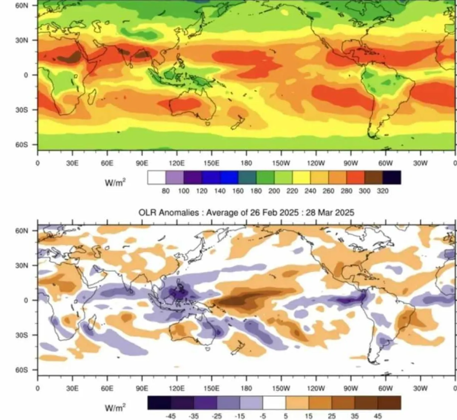 وجود ثنائية حمل حراري (convective anomaly dipole) في المحيط الهادئ، مع قمع الحمل الحراري في وسطه ونشاط قوي قرب إندونيسيا.