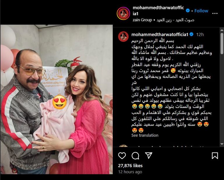 عبّر محمد ثروت عن فرحته الكبيرة بولادة طفلته، حيث كتب في منشوره:"بسم الله الرحمن الرحيم، اللهم لك الحمد كما ينبغي لجلال وجهك وعظيم سلطانك.. بسم الله ما شاء الله، لا حول ولا قوة إلا بالله. رزقني الله الكريم يوم وقفة عيد الفطر المبارك ببنوته قمر محمد ثروت، ربنا يجعلها من الذرية الصالحة ويحفظها من أي شر."
