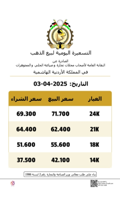 شهدت أسعار الذهب في الأردن انخفاضاً كبيراً بمقدار 110 قروش في التسعيرة الثالثة.