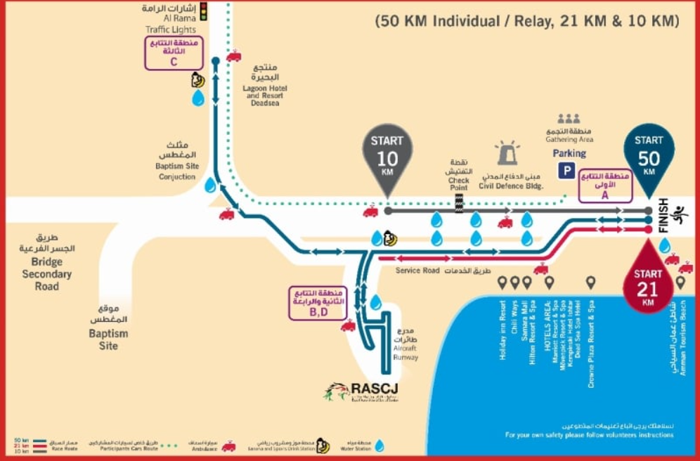وقت ا̈لإنطلاق في تمام الساعة 6:00 صباحاً. البداية مقابل شاطئ عمان السياحي بالبحر الميت، والجري صعوداً بشارع الخدمات (بعكس إتجاه حركة السير) بإتجاه منطقة الفنادق وصولاً إلى الشارع المؤدي إلى منطقة السكاي دايف، والانعطاف يساراً دخولاً إلى منطقة السكاي دايف والإلتفاف من الدوارالموجود داخل المنطقة والدخول إلى مهبط الطائرات ومن ثم العودة إلى شارع الخدمات ومتابعة الجري باتجاه إشارات الرامة للوصول إلى نقطة الالتفاف الخاصة بسباق 50كم قبل الوصول إشارات الرامة والعودة مرة أخرى لاستكمال الجري وصولا إلى شارع الخدمات والدخول إلى منطقة نادي الرياضات الجوية الملكي الأردني (سكاي دايف) ومهبط الطائرات مرة اخرى ومن ثم الجري على نفس المسار نزولا باتجاه شاطئ عمان السياحي إلى (خط النهاية).