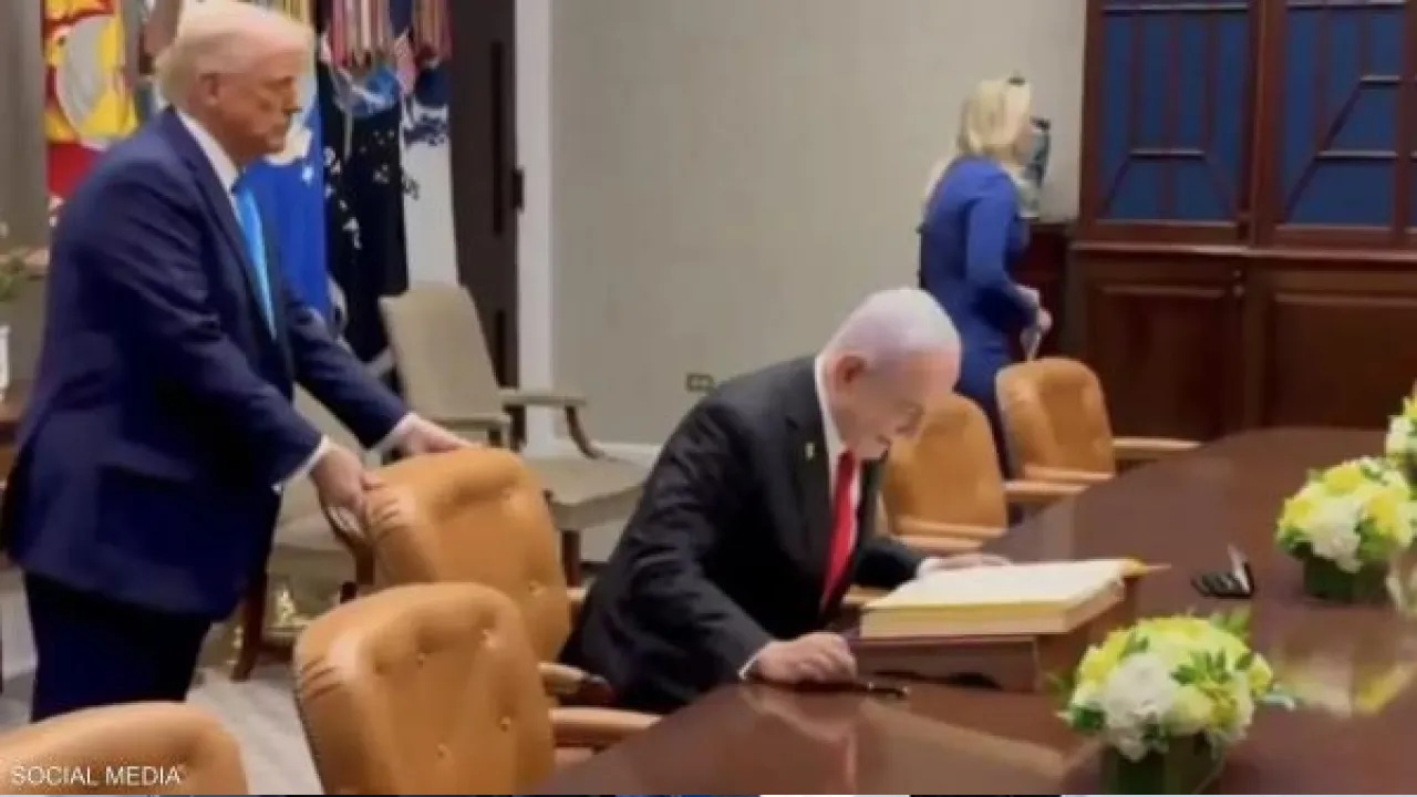 وأظهرت مقاطع فيديو نشرتها وسائل إعلام عبرية، ترامب وهو يقوم بتعديل الكرسي لنتنياهو عند جلوسه.