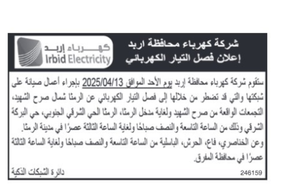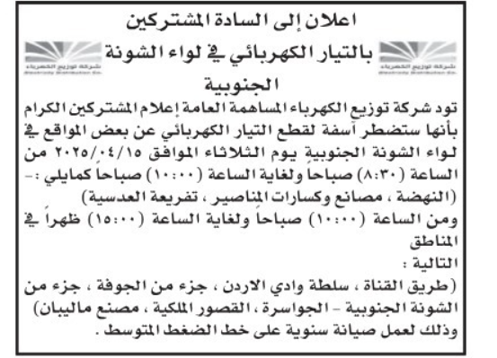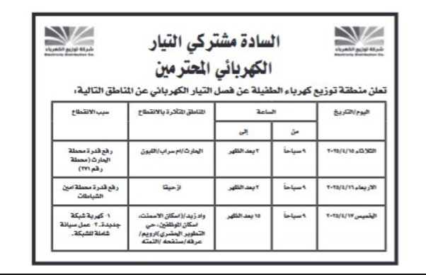 أعلنت شركات كهرباء إربد وتوزيع الكهرباء عن فصل التيار الكهربائي عن مناطق ضمن اختصاصها خلال الأسبوع الحالي.