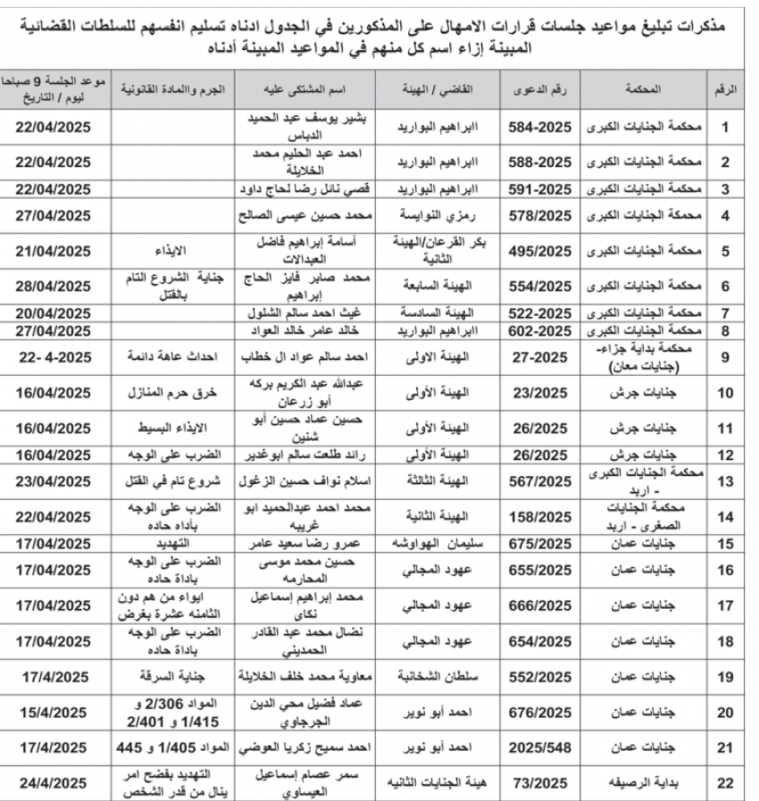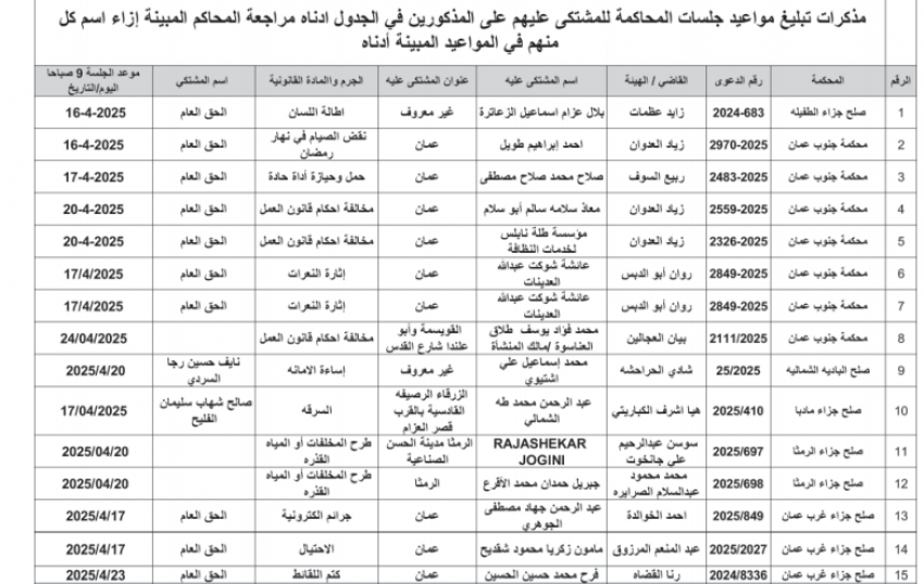 صدرت اليوم الاثنين، مذكرات تبليغ مواعيد جلسات محاكمات لمشتكى عليهم بتهم مختلفة وقرارات إمهال لحضور جلسات محاكمة.