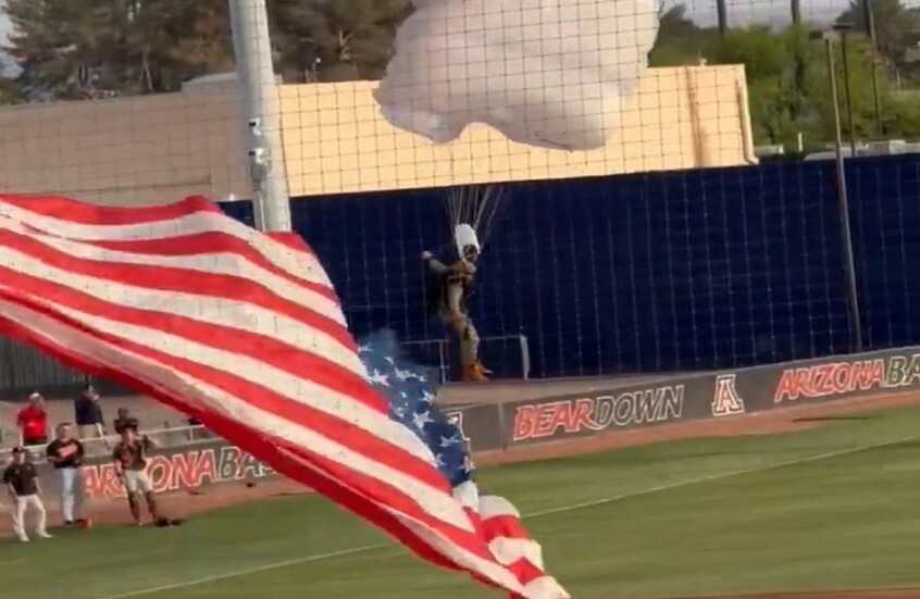 وظهر في مقطع فيديو متداول على مواقع التواصل الاجتماعي أحد المظليين وهو يحمل علم فريق "أريزونا وايلدكات" يهبط بسرعة كبيرة قبل أن يصطدم بالأرض ويتدحرج. ثم يليه مظلي آخر يحمل العلم الأمريكي في هبوط شديد، بينما يُسمع في الخلفية صوت الجمهور الذي بدا عليه القلق.
