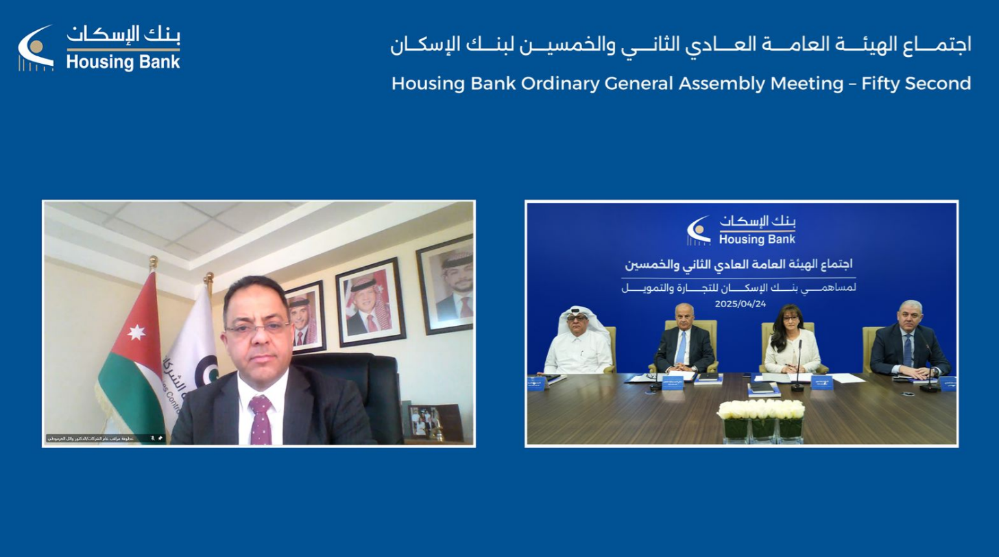 وافقت الهيئة العامة لمساهمي بنك الإسكـان للتجارة والتمويل في اجتمـاعها العادي بتاريخ 24/04/2025 على البيانات المالية لعام 2024 بما في ذلك الموافقة على توصية مجلس الإدارة بتوزيع أرباح نقدية بنسبة (30%) من القيمة الاسمية للسهم لمساهمي البنك عن عام 2024، كما صادقت على تقرير مجلس الإدارة لعام 2024 والخطة المستقبلية لعام 2025 وعلى تقرير مدققي حسابات البنك للعام 2024 وانتخاب شركة برايس ووتر هاوس كوبرز (PWC) لتدقيق حسابات البنك للعام 2025.