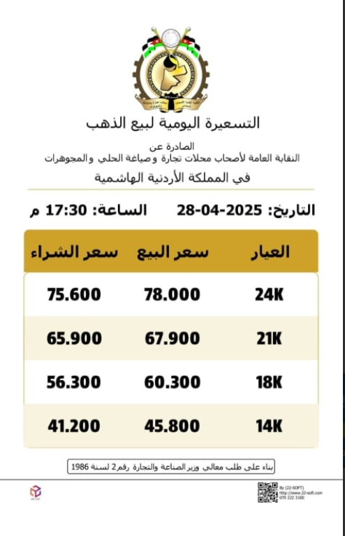 وبحسب النقابة العامة لأصحاب محلات تجارة وصياغة الحلي والمجوهرات ، بلغ سعر غرام الذهب عيار 21 الذي يعتبر الأكثر طلبا بين الأردنيين 67.9 دينار مقابل 65.9 دينار / للغرام للشراء.