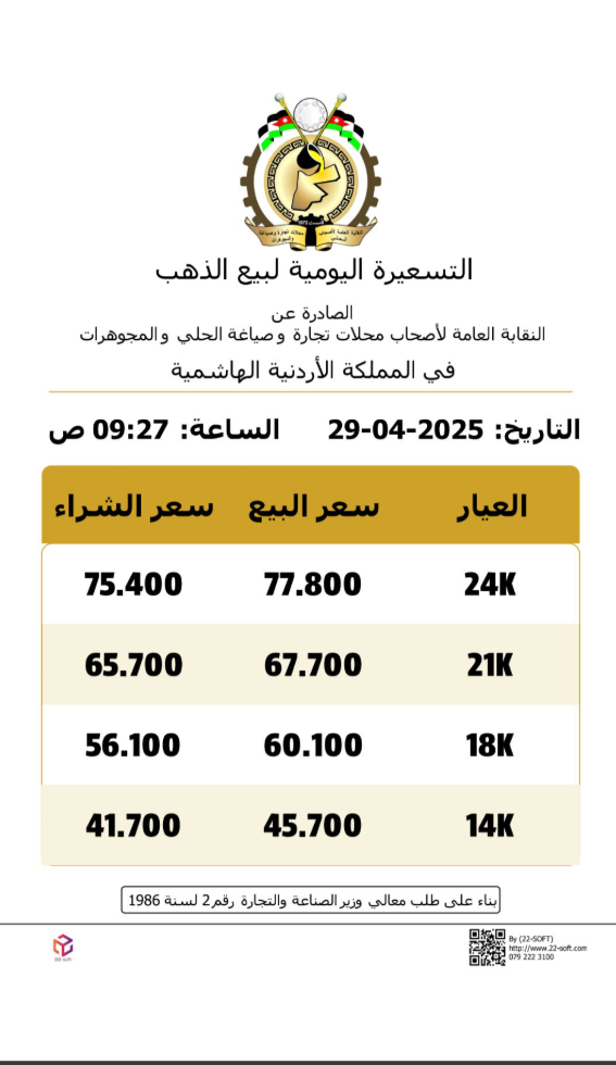 كما بلغ سعر بيع الغرام الواحد من الذهب عيارات 24 و18 و14 لغايات الشراء من محلات الصاغة، 77.8 و60.10 و45.70 دينارا على التوالي.