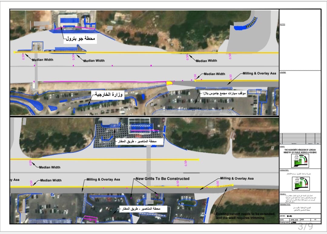 اعلنت وزارة الأشغال العامة والإسكان عن بدء تنفيذ مشروعين مهمين يهدفان إلى تحسين حركة المرور وتطوير البنية التحتية للطرق ضمن مناط اختصاصها في العاصمة عمان، حيث سيتم إنشاء طريق خدمة على طريق المطار في المنطقة الممتدة من وزارة الخارجية وحتى ما بعد محطة المناصير للمحروقات على الجانب القادم من الدوار السابع باتجاه المطار وعلى الجهة المعاكسة من محطة المناصير وحتى محطة جوبترول كما سيتم تنفيذ أعمال تأهيل الجزيرة الوسطية على شارع الملك عبدالله الثاني من الدوار الثامن وحتى نفق الملتقى بطول 2 كلم تقريباً.