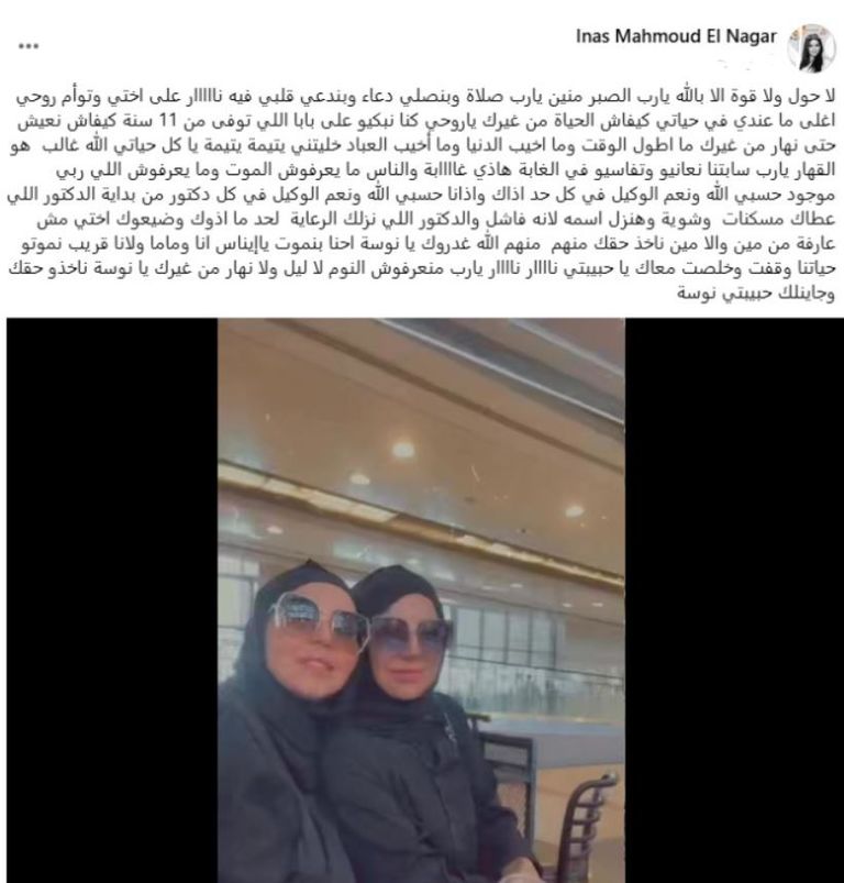 وقالت شقيقة النجار عبر حسابها على فيسبوك، إن إيناس حصلت على مسكنات من طبيب وصفته بـ"الفاشل"، وأن طبيبًا آخر أدخلها إلى غرفة الرعاية دون اتخاذ الإجراءات المناسبة، مضيفة: "سأعلن اسمه قريبًا لأنه أذاها".