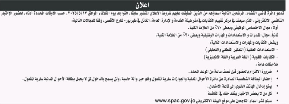 دعت دائرة قاضي القضاة، اليوم الثلاثاء، عددًا من المرشحين المدرجة أسماؤهم إلى التقدّم للامتحان التنافسي الإلكتروني، والمقرر عقده يوم الثلاثاء الموافق 13 أيار 2025، في مركز تقييم الكفايات التابع لهيئة الخدمة والإدارة العامة، والواقع في منطقة طبربور – شارع الأقصى بالعاصمة عمّان.
