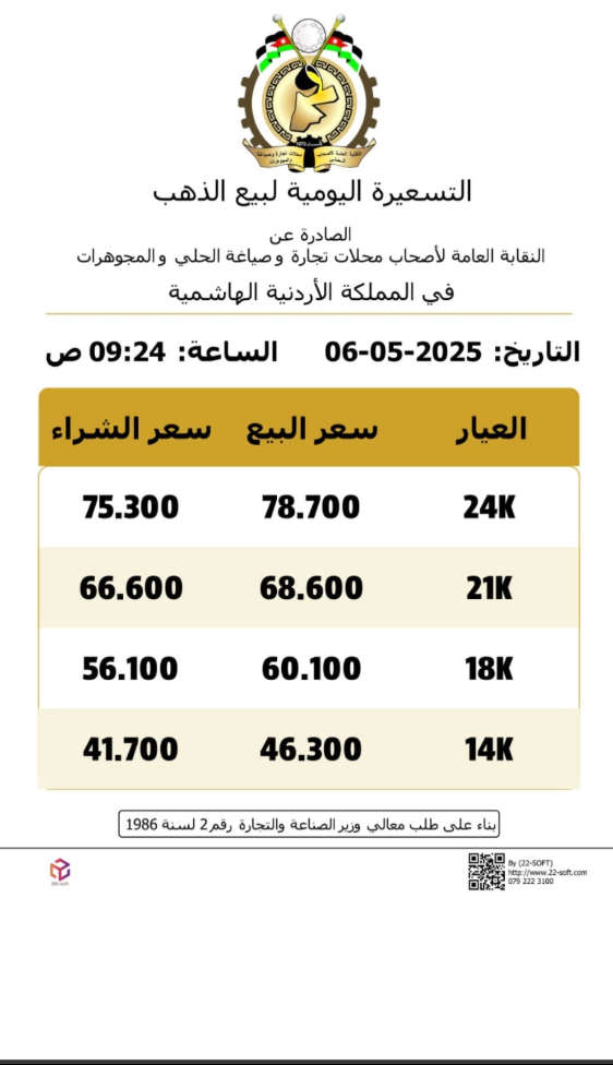 كما بلغ سعر بيع الغرام الواحد من الذهب عيارات 24 و18 و14 لغايات البيع من محلات الصاغة، 78.70 و60.10 و46.30 دينارا على التوالي.