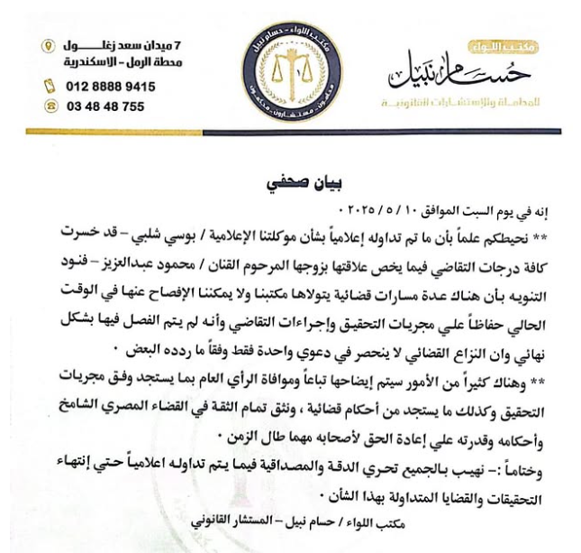 وجاء في البيان :"نحيطكم علماً بأن ما تم تداوله إعلامياً بشأن موكلتنا / بوسي شلبي قد خسرت كافة درجات التقاضي، فيما يخص علاقتها بزوجها الراحل محمود عبد العزيز، فنود التنويه بأن هناك عدة مسارات قضائية يتولاها مكتبنا ولا يمكننا الإفصاح عنها في الوقت الحالي حفاظا على مجريات التحقيق وإجراءات التقاضي، وأنه لم يتم الفصل فيها بشكل نهائي، وأن النزاع القضائي لا ينحصر في دعوي واحدة فقط وفقا ما ردده البعض وهناك كثيرا من الأمور سيتم إيضاحها تباعا وموافاة الرأي العام بما يستجد وفق مجريات التحقيق وكذلك ما يستجد من أحكام قضائية، ونثق تمام الثقة في القضاء المصري الشامخ وأحكامه وقدرته على إعادة الحق لأصحابه مهما طال الزمن، وختاما نهيب بالجميع تحري الدقة والمصداقية فيما يتم تداوله إعلاميا حتى إنتهاء التحقيقات والقضايا المتداولة بهذا الشأن".