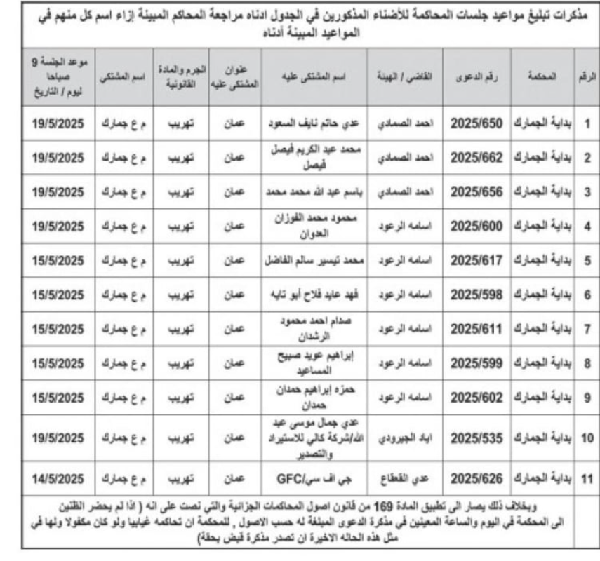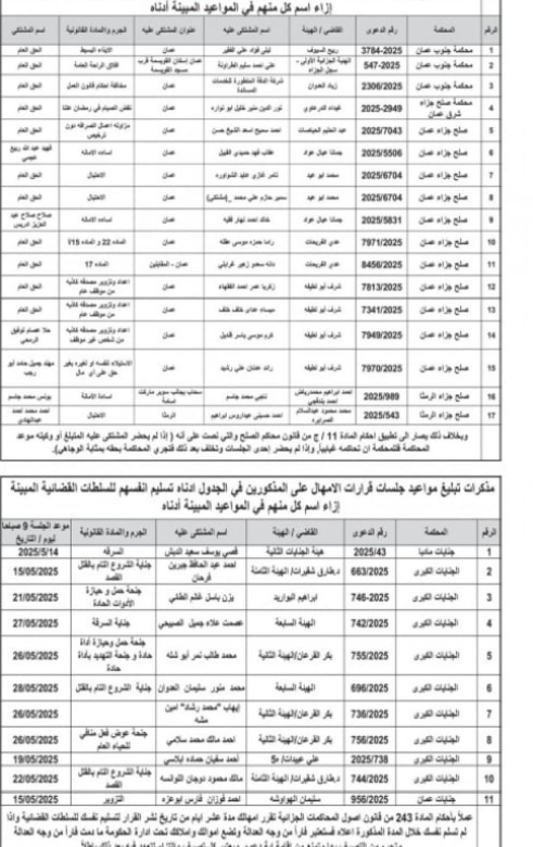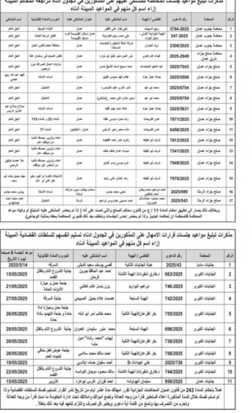 وطلبت المذكرات من المذكورين في الجداول أدناه مراجعة المحاكم المبينة ازاء اسم كل منهم في المواعيد المبينة أدناه.