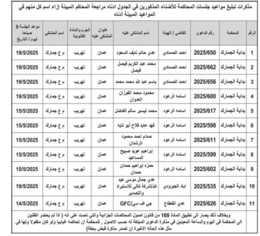 صدرت اليوم الاثنين، مذكرات تبليغ مواعيد جلسات المحاكمة لمشتكى عليهم ولمتهمين وقرارات امهال لحضور جلسات محاكمة.