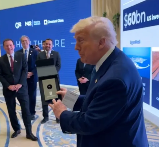 تلقى الرئيس الأمريكي دونالد ترمب خلال زيارته إلى الإمارات، هدية رمزية عبارة عن "قطرة نفط واحدة" خلال مراسم الاستقبال في أبوظبي، في إشارة إلى أهمية النفط في العلاقات بين البلدين.