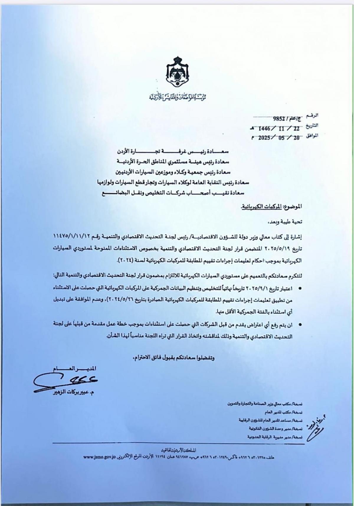 وأكدت المؤسسة، في كتاب رسمي وجهته إلى الجهات المعنية في قطاع السيارات والتخليص، أن القرار جاء بناءً على توصية صادرة عن لجنة التحديث الاقتصادي بتاريخ 12/3/2025، والتي شددت على أهمية تنظيم سوق المركبات الكهربائية وفق الأطر التشريعية والمواصفات الفنية المعتمدة، حمايةً لسلامة المستخدمين.