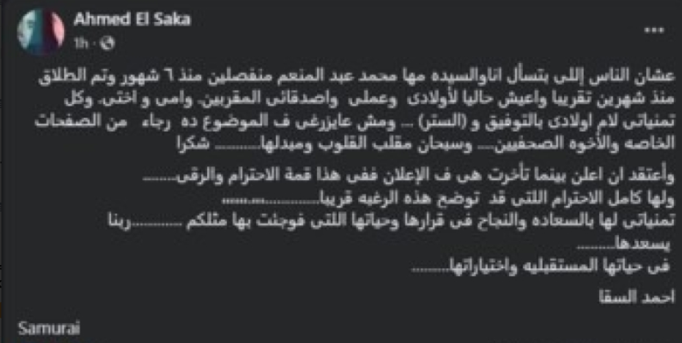وكان قد جاء في منشور السقا: "رداً على تساؤلات البعض، أنا والسيدة مها محمد عبد المنعم منفصلان منذ ستة أشهر، وتم الطلاق رسميًا قبل نحو شهرين، أعيش الآن من أجل أولادي وعملي وأصدقائي المقربين ووالدتي وشقيقتي، وأتمنى لأم أولادي كل التوفيق والستر".