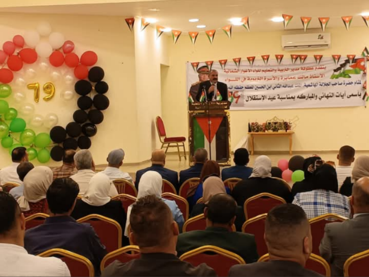 احتفلت مديرية التربية والتعليم للواء الأغوار الشمالية اليوم، بالذكرى التاسعة والسبعين لاستقلال المملكة الأردنية الهاشمية، في حفل أقيم في مؤسسة إعمار الأغوار، برعاية مدير التربية والتعليم الدكتور مالك العمايرة، وبحضور مديرة الشؤون التعليمية الدكتورة لبنى الشاويش، وعدد من رؤساء الأقسام التربوية، ومديري ومديرات المدارس، والكوادر التعليمية في اللواء.