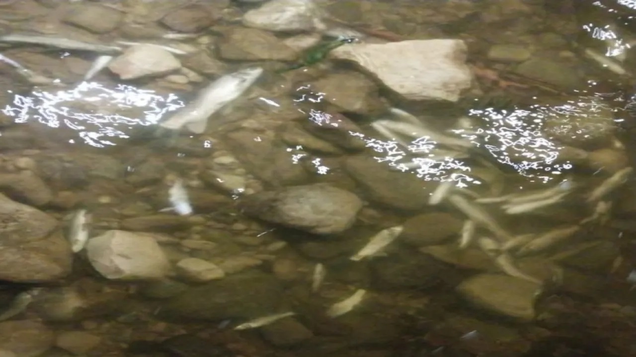 وشوهدت أعداد كبيرة من الأسماك النافقة على ضفاف السيل.