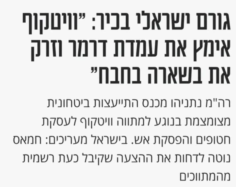 كشفت صحيفة معاريف الإسرائيلية عن مصدر إسرائيلي رفيع أن "ويتكوف تبنى مقترح رون دريمر، وتخلى عن بشارة بحبح".