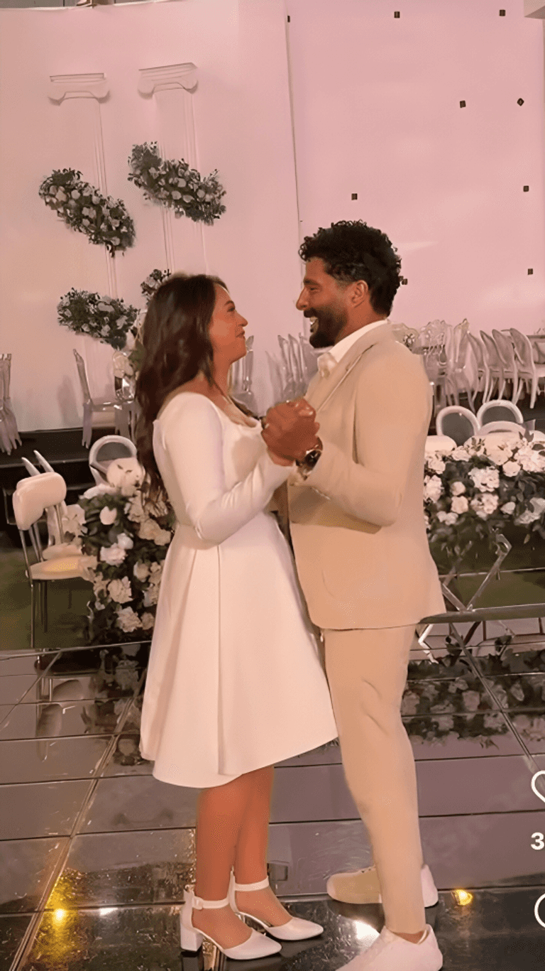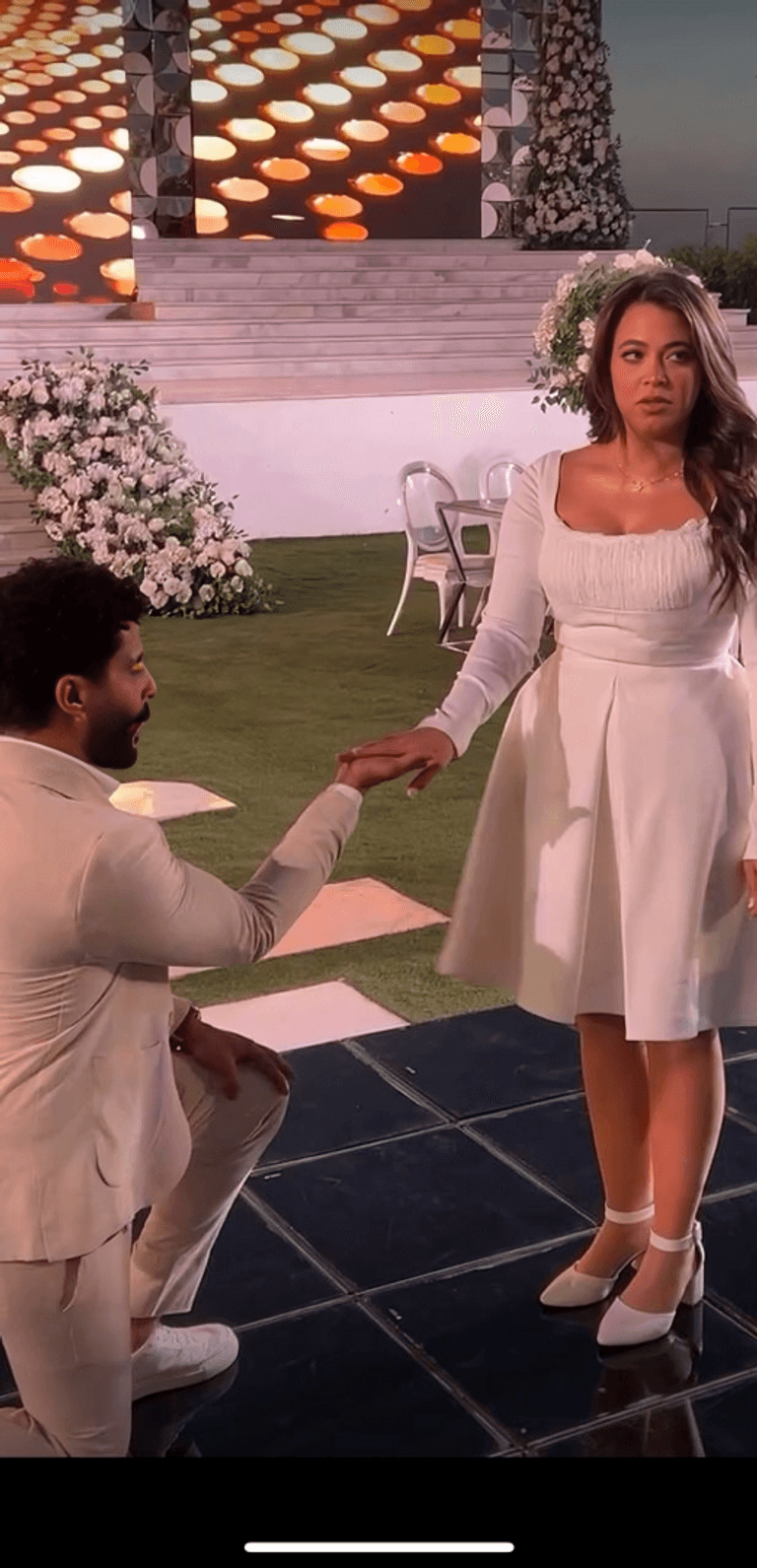 ظهرت الفنانة هايدي رفعت، وهي ترتدي فستانًا أبيض أنيقًا اتسم بالبساطة والرقي، فيما اختار الفنان مصطفى منصور إطلالة كلاسيكية رسمية، عكست أجواء الحفل الهادئة. وتبادل العروسان الضحكات والنظرات الودودة وسط تصفيق وترحيب الحاضرين.