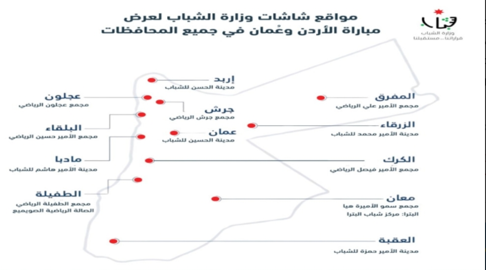 بتوجيه من صاحب السمو الملكي الأمير الحسين بن عبدالله الثاني ولي العهد، تقوم وزارة الشباب بعرض مباراة الأردن وعمُان يوم الخميس من خلال شاشات عرض في المدن الرياضية والمرافق / المديريات / المنشآت التابعة للوزارة، في محافظات المملكة كافة.