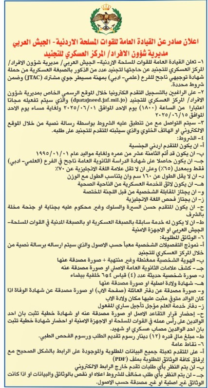 أعلنت القيادة العامة للقوات المسلحة الأردنية - الجيش العربي - مديرية الأفراد - المركز العسكري للتجنيد اليوم الأحد عن حاجتها لتجنيد عدد من الذكور بالصبغة العسكرية من حملة شهادة توجيهي ناجح للفرع (علمي - أدبي) بمهنة مسيطر جوي مشترك JTAC وضمن شروط محددة.