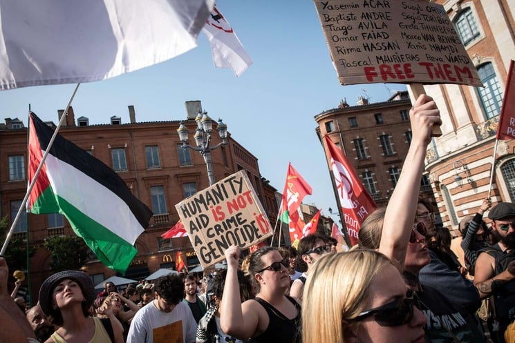 ورفع المحتجون لافتات كتب عليها “أوقفوا الإبادة”، “لا لإرسال السلاح إلى إسرائيل”، “ارفعوا أيديكم عن أسطول الحرية”، و”إسرائيل دولة إرهابية”، وسط شعارات تدعوا لوقف الإبادة الجماعية في غزة وتطالب بالحرية لفلسطين.