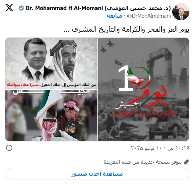 ونشر المومني تغريدة عبر حسابه الشخصي على "إكس" جاء فيها "يوم العز والفخر والكرامة والتاريخ المشرف".