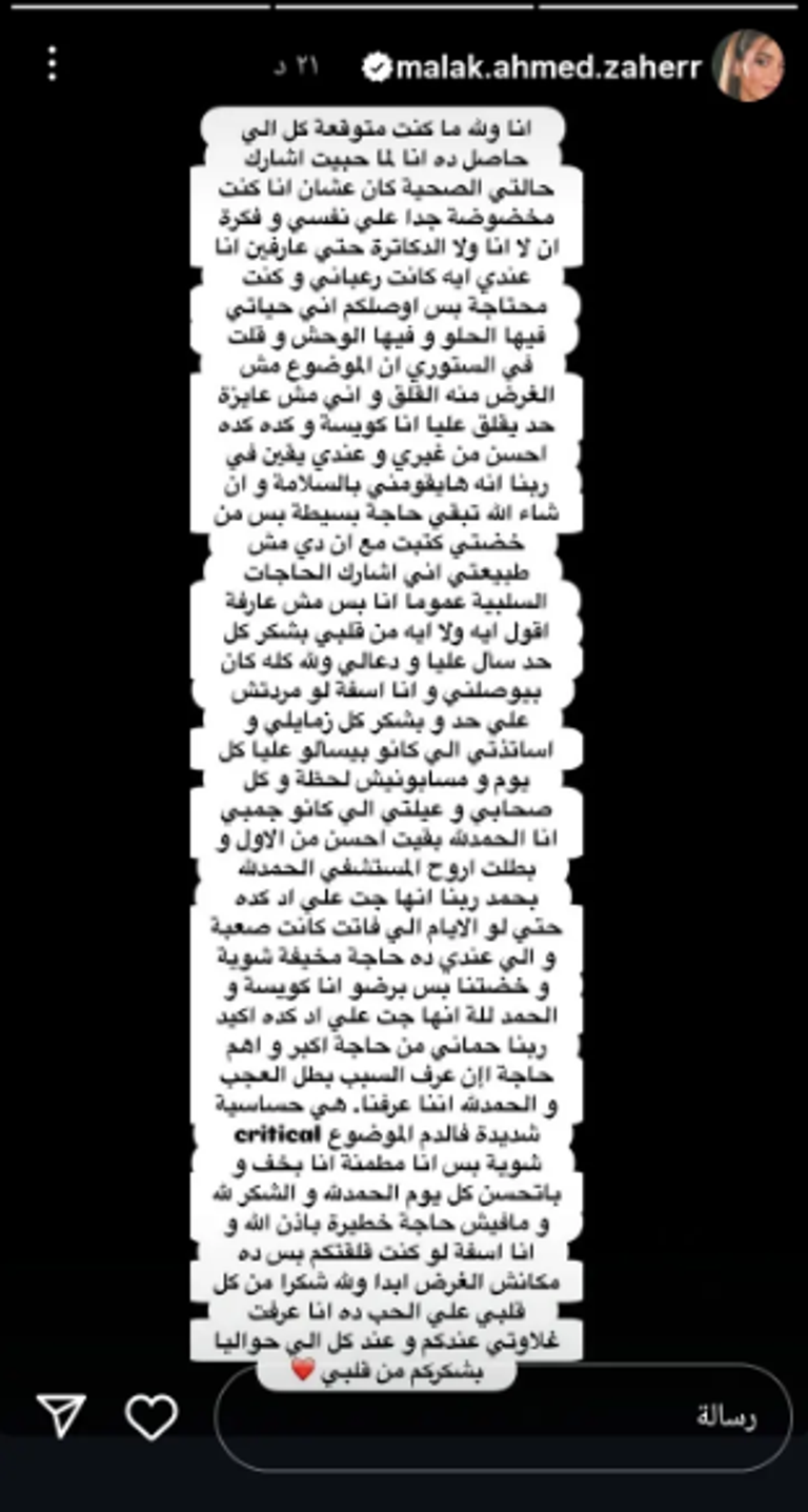 واختتمت ملك زاهر رسالتها بتوجيه الشكر لجمهورها على الحب والدعم، مؤكدة أنها تتحسن تدريجيًا وأن حالتها ليست خطيرة، قائلة: "أشعر بتحسن يومي، وشكرًا لكل من أظهر لي هذا الحب الكبير".