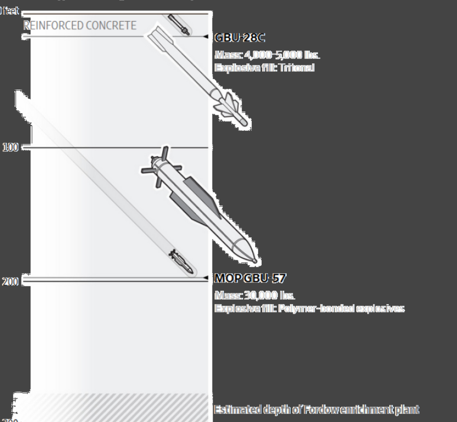 وأشار مارك كانسيان، الذي عمل سابقاً في وزارة الدفاع الأميركية، إلى أن هذا النوع من القنابل صُمم خصيصاً لهذا النوع من الأهداف، حيث كلف تطويره نحو 400 مليون دولار، ويجري إسقاطه من قاذفات الشبح "بي-2". وتحتفظ الولايات المتحدة حالياً بنحو 20 قنبلة من هذا الطراز.