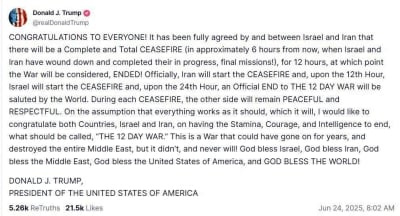 مبروك للجميع! لقد تم الاتفاق الكامل والنهائي بين إسرائيل وإيران على وقف إطلاق نار كامل وشامل (سيبدأ بعد حوالي 6 ساعات من الآن، حين تُنهي إسرائيل وإيران ما تبقى لديهما من مهام عسكرية أخيرة)، لمدة 12 ساعة، وعندها سيتم اعتبار الحرب منتهية!