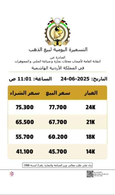 انخفضت أسعار الذهب في السوق المحلي الثلاثاء، حيث بلغ سعر بيع غرام الذهب عيار 21 الأكثر طلبا، 67.700 دينارا لغايات البيع من محلات الصاغة، مقابل 65.500 دينارا لجهة الشراء، وفقا للنقابة العامة لأصحاب محال تجارة الحلي والمجوهرات.