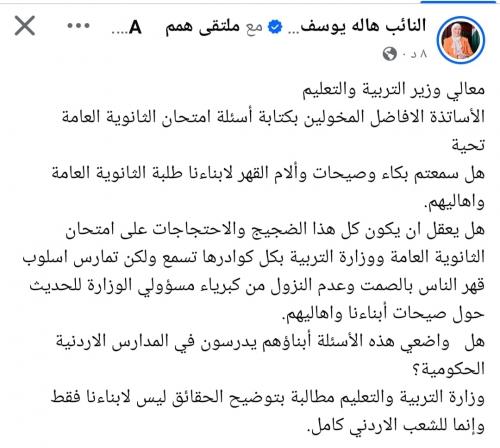 وجهت عضو لجنة التربية والثقافة والشباب في مجلس النواب الأردني العشرين النائب هالة جراح رسالة إلى وزير التربية والتعليم الدكتور عزمي محافظة، حول ردود فعل طلبة التوجيهي على امتحان الرياضيات.