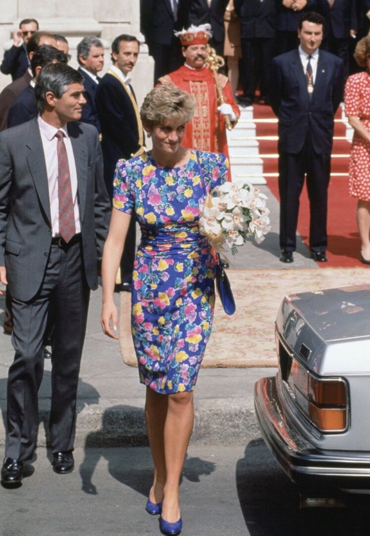 وبين عامي 1988 و1992، ارتدت ديانا فستانا أزرق مزخرف بنقشة زهور، من قماش الكريب دي شين (حريري) في العديد من زياراتها إلى المستشفى، ومن هنا جاء لقبه: "فستان الرعاية".