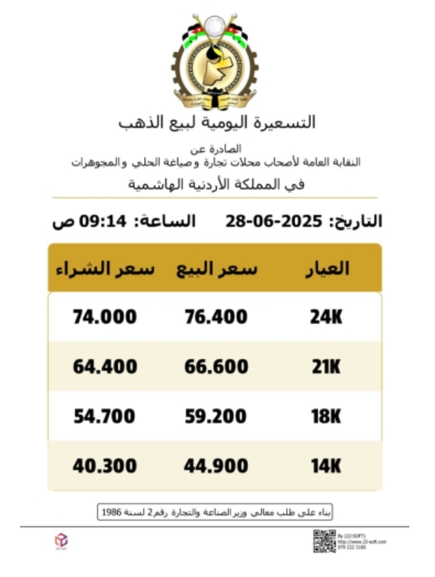 انخفضت أسعار الذهب محليا اليوم السبت، بواقع دينار و10 قروش للغرام، حيث بلغ سعر غرام الذهب من عيار 21 الأكثر طلبا من المواطنين 66.6 دينارا، وفق نقابة الحلي والمجوهرات.