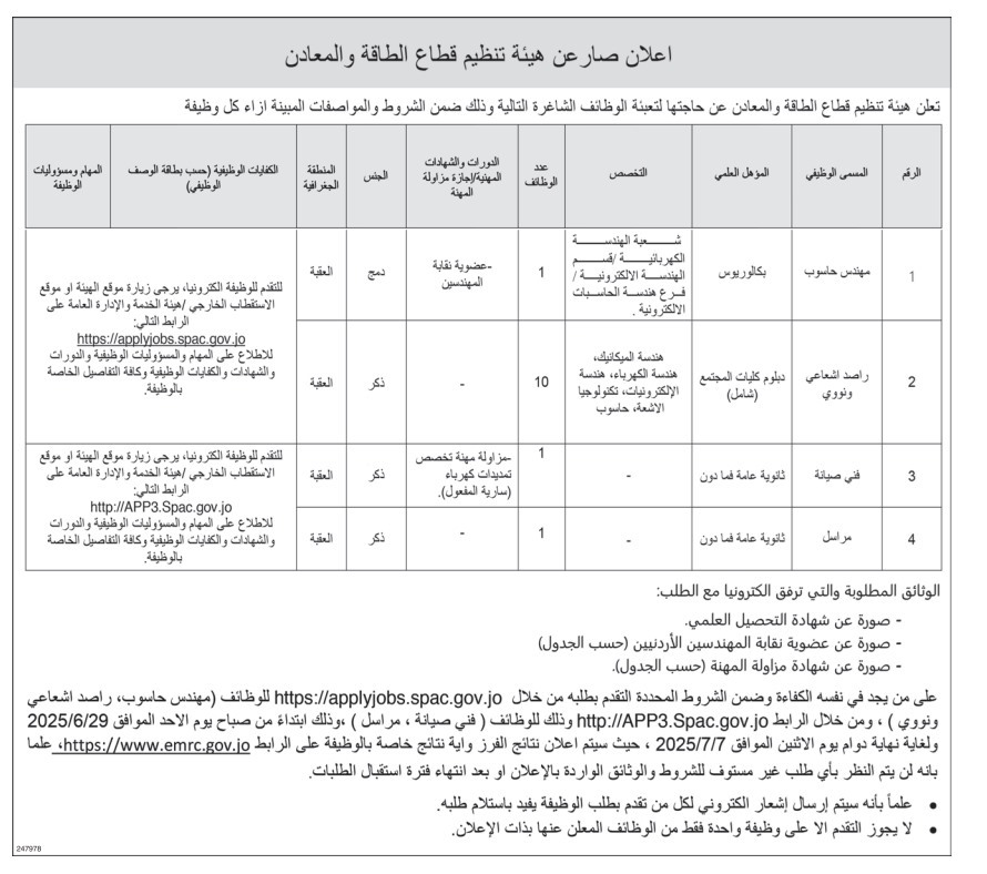 أعلنت هيئة تنظيم قطاع الطاقة والمعادن عن حاجتها لتعبئة وظائف شاغرة من بينها 10 بوظيفة راصد اشعاعي ونووي.