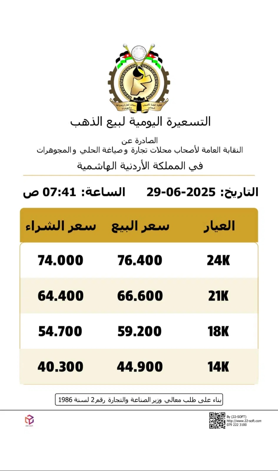 اظهرت التسعيرة اليومية لبيع الذهب في الاردن لهذا اليوم، الصادرة عن النقابة العامة لاصحاب محلات تجارة وصياغة الحلي والمجوهرات اسعار عيارات الذهب الاربعة المتداولة في السوق الاردني.