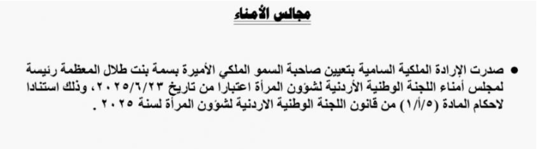 صدرت في عدد الجريدة الرسمية اليوم الثلاثاء، الإرادة الملكية السامية بتعيين صاحبة السمو الملكي الأميرة بسمة بنت طلال، رئيسة لمجلس أمناء اللجنة الوطنية الأردنية لشؤون المرأة اعتبارا من تاريخ ٢٠٢٥/٦/٢٣.