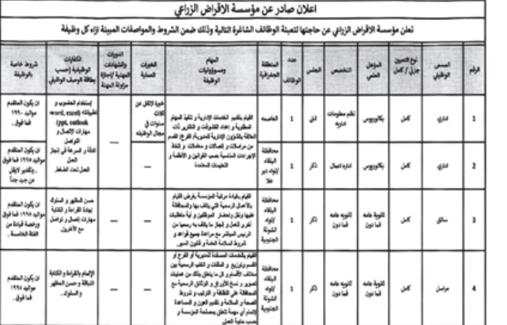 أعلنت مؤسسة الإقراض الزراعي عن توفر عدد من الوظائف الشاغرة في مختلف المجالات.