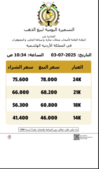 شهدت أسعار الذهب في الأسواق المحلية ، اليوم الخميس ارتفاعًا بحسب التسعيرة اليومية الصادرة عن النقابة العامة لأصحاب محلات تجارة وصياغة الحلي والمجوهرات في المملكة الأردنية الهاشمية.