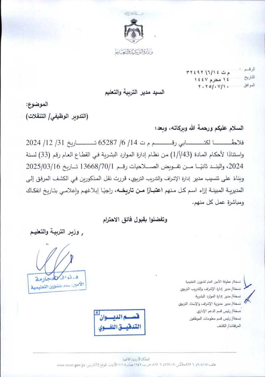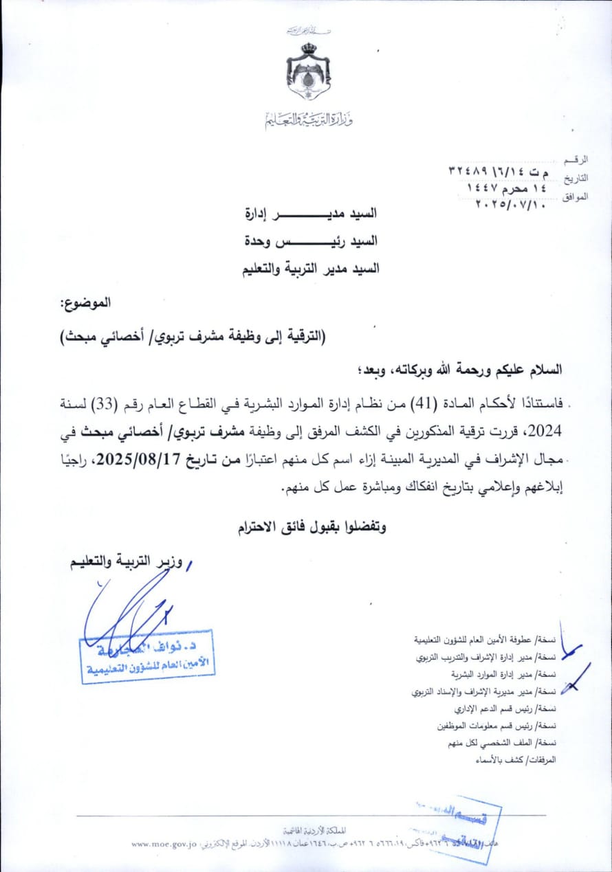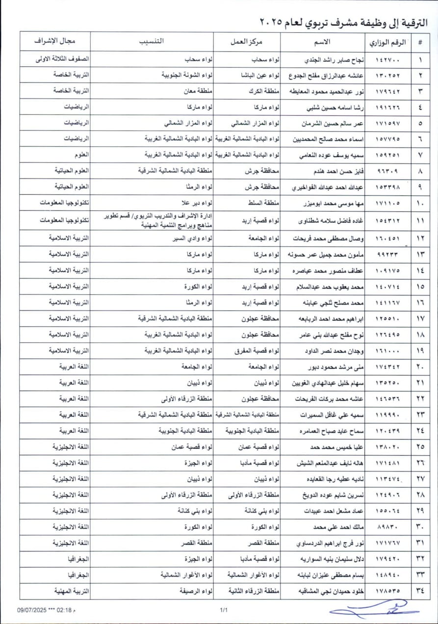 قرر وزير التربية والتعليم ترقية المذكورين في الكشف المرفق أدناه إلى وظيفة مشرف تربوي / أخصائي مبحث في مجال الإشراف والمديرية المبيّنة إزاء اسم كلّ منهم اعتبارا من تاريخه.