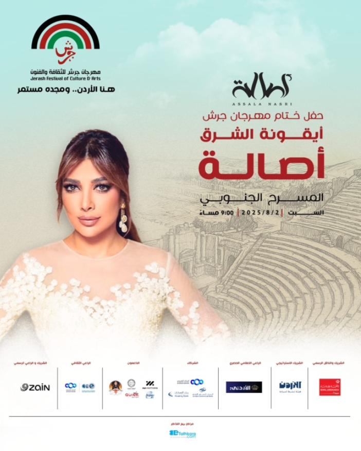 في ليلة منتظرة تُتوّج بها فعاليات مهرجان جرش للثقافة والفنون 2025، تحيي النجمة أصالة نصري أمسية ختامية تخطف الأنفاس، وتُشعل المسرح الجنوبي يوم الجمعة 2 آب، تحت سماء المدينة التاريخية.
