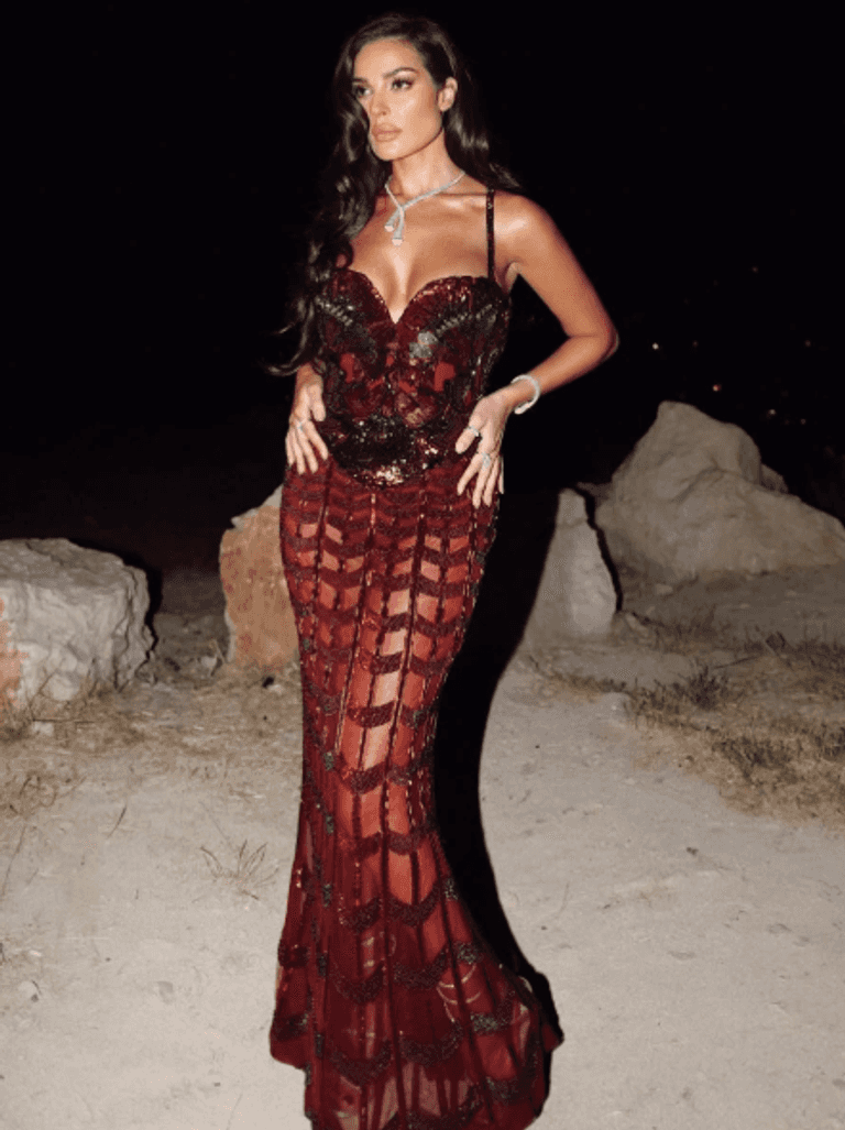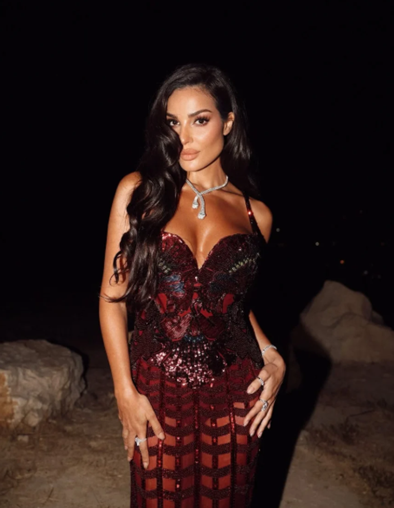 واختارت نادين فستاناً عنّابي اللون بقماش شفاف مرصّع بترتر وخرز فخم، منحها إطلالة ساطعة تعكس أضواء المكان وتبرز قوامها الممشوق، حيث جاء التصميم ضيقاً وطويلاً مع تدرج ناعم عند الأسفل يواكب خطواتها بانسيابية رشيقة.