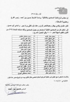 وقال القرار رقم (388) الصادر عن فرع النقابة، إن قرار شطب المحامين جاء استناداً للمادة رقم (23) من قانون تنظيم المهنة للعام 2010، وتضم القائمة 36 اسماً من محامي فرع نقابة المحامين في اللاذقية.